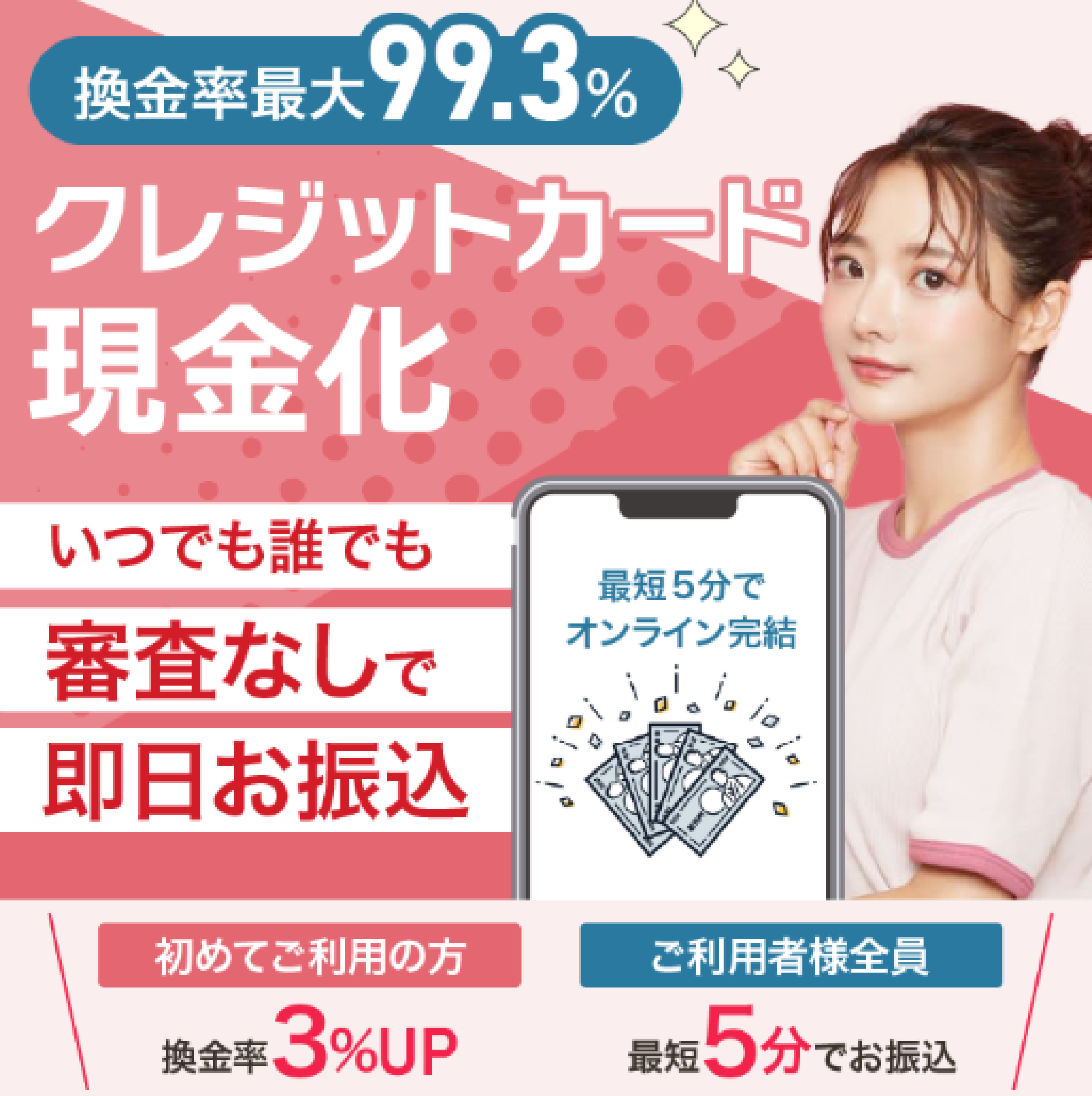 まとまった現金が必要で、2枚のクレカで利用できるのがありがたかったです。現金はまとめてすぐ振り込まれました。
